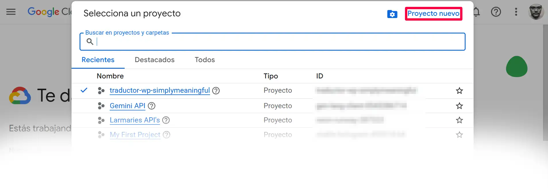 - Asegúrate de que tu nuevo proyecto esté seleccionado en el selector de la parte superior.
